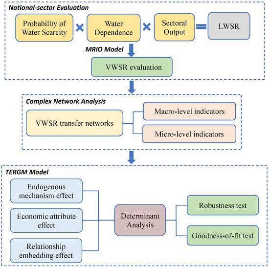 This study first quantifies the LWSR for 159 countries. Then, the multi-regional input–output (MRIO) model and complex network method are combined to construct the global VWSR transfer network for 2001–2016, and its structural characteristics and spatial patterns are investigated. TERGMs are used to explore the mechanisms of endogenous structural effects and exogenous factors that influence the evolution of VWSR transfer networks. The study provides a theoretical basis and policy implications for promoting a virtuous cycle of international trade and sustainable use of water resources.