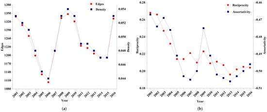 The macro-level structural characteristics of the global VWSR transfer network for the period 2001–2016 are shown in Table 2. It can be observed that the number of edges and network density tends to decrease over time, bottoming out in 2006 and slowly rising thereafter. This may be related to the global supply chain crisis triggered by the outbreak of the US subprime mortgage crisis in 2006, resulting in the sparse VWSR transfer network. Figure 2a shows the trend of the number of edges and density in the VWSR transfer network over time.