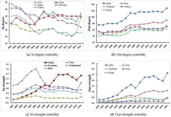 From the outflow side of the VWSR, as shown in Figure 3b,d, economic losses due to water shortages are mainly from Asia, including countries such as India, Iran and Thailand. Losses in these countries can lead to potential economic losses in other economies through trade. India and Iran are the top two countries in terms of the out-degree and out-strength from 2001–2016, and show a strong increasing trend. This indicates that they are the main source of VWSR for many downstream economies in the international supply chain and contribute the most to VWSR outflows. Therefore, downstream countries should reduce imports from these countries to improve their robustness against water scarcity risks abroad.