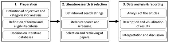 The SLR of this paper applied the well-established Preferred Reporting Items for Systematic Reviews and Meta-Analyses (PRISMA) statement []. Figure 1 shows the general procedure of the review process. It incorporates multiple process steps as suggested in other reviews [,,]. First, a preparation was carried out by clarifying the scope of the review []. This included the definition of suitable categories for analysis. Furthermore, formal and eligibility criteria were defined with respect to the research objective. This step also contained the decision on the literature databases. Second, the literature search was performed, which covered the formulation of search strings, paper screening and the selection of articles in scope []. Third, a detailed reading and analysis of the selected papers was conducted, followed by a description and interpretation of the results [,]. The steps of this review process are further explained in the remainder of this section.
