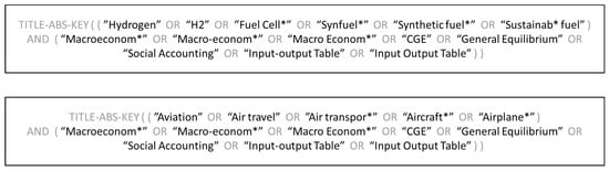 Figure 2 displays the two search strings for the CGE literature on hydrogen and aviation which covered the title, abstract and keywords. Both strings consisted of a content and a method part, which were connected by the Boolean operator “AND” to ensure results’ compliance with the eligibility criteria. Furthermore, the keywords within the content and method parts were connected by the “OR” operator. As a result, the SLR covered articles that matched at least one keyword from the content and one from the method part each. The content part of the search string considered any relevant content-related records. For hydrogen, the keyword focus was on application technologies, such as fuel cells and synthetic fuels []. For the content part of the aviation-related search string, we selected five keywords, namely “Aviation”, “Aircraft*”, “Airplane*”, “Air travel” and “Air transport*” to cover relevant aspects of the ATS. The use of “*” at the end of a term implied that any ending of that word was covered (e.g., “Airplane*” covered “Airplane” as well as “Airplanes”). The method part took into account the macroeconomic perspective, i.e., the application of a CGE model. This part was equivalent for both strings and contained any potentially relevant keywords for the identification of CGE studies. Besides the terms “CGE” and “General Equilibrium”, we included different versions of “Macroeconom*” to the search strings. By doing so, the SLR considered macroeconomic studies that comprised a CGE model not explicitly mentioned in the title, abstract or keywords. Three additional terms were added to cover the main data sources (i.e., SAM and IO tables) for CGE models (see [,,]).