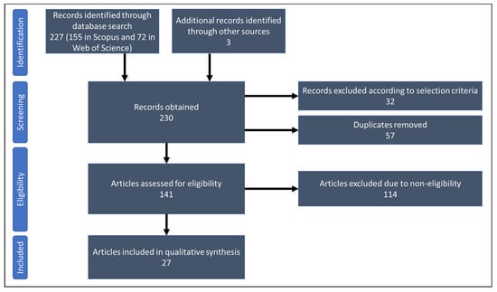 The aviation selection process revealed 27 relevant articles (Figure 4). Starting from a sample of 230 articles, 32 studies were excluded for not complying with the formal selection criteria and 57 duplicates were removed. Subsequently, we checked the remaining 141 papers for their eligibility with respect to the research objective. Our analysis focused on aviation, but also considered studies in other sectors as long as they had a particular spotlight on the ATS. The main requirement for inclusion was the CGE analysis of shocks affecting the ATS or policies with consequences to aviation. After excluding 114 records that did not meet this requirement, we ended up with a total of 27 aviation-related studies.