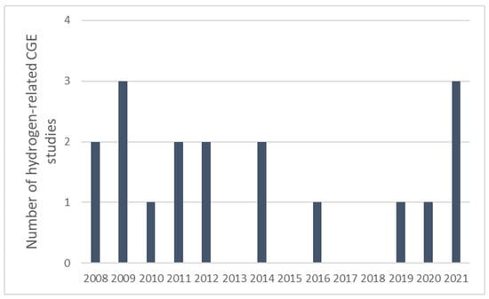 The SLR revealed 18 hydrogen-related CGE papers. The earliest publication was from 2008 and the most recent papers were from 2021 (see Figure 5). Most studies were carried out between 2008 and 2012, after which research declined. In recent years, hydrogen has been gaining momentum, which is also reflected in the CGE literature. In 2021, there were three hydrogen-related publications [,,]. Most journals combine economics and energy and thus have an interdisciplinary character. Overall, eight papers were published in “The International Journal of Hydrogen Energy” (e.g., [,]). Two journals stemmed from transportation research [,], which proves the application potential of hydrogen in this field. Table A1 provides an overview of the journal publications with a focus on hydrogen-related CGE studies.
