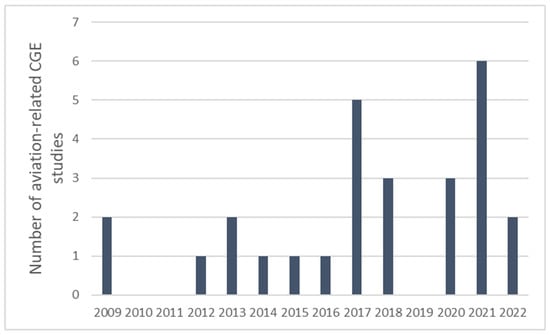 The SLR revealed a total of 27 aviation-related CGE papers. The earliest studies were from 2009 [,], but the relevance of CGE modeling in aviation research increased over time, with a peak of six publications in 2021 [,,,,,]. Figure 6 shows the trend of growing CGE publications dealing with aviation. The aviation-related studies came from a broad range of 18 different journals and varying disciplines. For instance, the sample covered articles on tourism (e.g., [,]), the environment (e.g., [,]) and energy research (e.g., [,]). Still, the dominant discipline among the papers was transportation research, with a total of ten studies (e.g., [,]). Table A2 provides an overview of the journal publications.