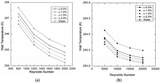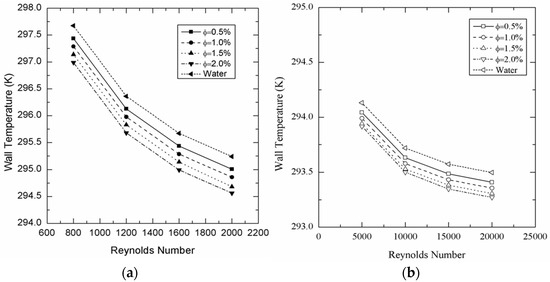 Variation of wall temperature with Re for Cu-water nanofluid. (a) Laminar condition. (b) Turbulent condition.