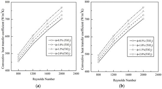 Average hconv with Re for TiO2–Water nanofluid. (a) Laminar condition. (b) Turbulent condition.