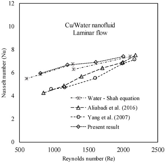 Figure 7 shows the effect of Re on the Nusselt number of DI water and nanofluids of different concentrations in a laminar flow regime. As shown, an increase in Nusselt number of DI water and Cu-water nanofluid is observed as the Re value is increased. Additionally, there is an increase in trend for Nu as Re increases. The highest Nu is noted for the maximum concentration of nanoparticles (ɸ = 2%) and the value is noted to be Nu = 6.2. An average enhancement of 7.2% is noted for the nanofluid with the maximum particle concentration (ɸ = 2%) when compared to that of base fluid. Enhancements in Nu with increases in Re and nanoparticle concentration are noted. Based on the results, the highest Nu value for laminar flow regime is noted to be Nu = 5 for ɸ = 2%. An average enhancement of 14.6% is noted for the maximum particle concentration when compared to the base fluid. It is observed that, the addition of Cu nanoparticles enhances the thermal conductivity of the base fluid. In the case of nanofluids, hconv increases with higher nanoparticle concentration. In contrast, an increase in nanoparticles enhances viscosity and leads to an increase in thermal boundary layer thickness. This may cause a reduction in Nu and the heat transfer coefficient value. However, based on Figure 7, it can be observed that the addition of nanoparticles increases the Nu which indicates that the thermal conductivity enhancement in the nanofluid overcomes the viscosity effect and leads to higher heat transfer. Moreover, this thermal conductivity enhancement is due to the particle migration hypothesis.