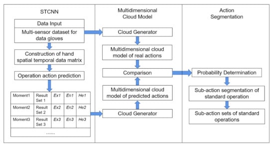 Therefore, this paper proposes STCNN-MCM for solving some of the problems of traditional action segmentation and improving the accuracy of action segmentation. Firstly, the hand action data is obtained during the operation through the data gloves, and the hand spatial-temporal data matrix is constructed based on the hand-structure sequence; the convolutional layer is then modified to add the attention mechanism to complete the training of STCNN, and the multi-result dataset constructed based on the prediction results of STCNN. Finally, the corresponding probability is obtained through the distribution of the predicted data in the cloud model in the multi-result dataset for the action-segmentation points, which are determined to complete the segmentation of the testers’ actions.