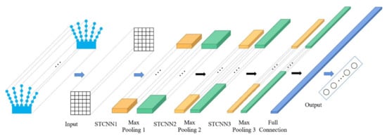 where is the size of the 3D kernel in the time dimension and is the value of the position in the kernel connected to the previous layer of the feature map. The STCNN structure used in this paper is shown in Figure 3.