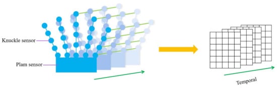 After determining the use of STCNN, the hand spatial-temporal data matrix is required to be constructed for this model as input. The hand spatial data matrix needs to be constructed based on the hand-structure map of the data glove in order to be able to express the motion characteristics of the whole hand movement. The construction of the whole hand spatial-temporal data matrix can be performed in two steps. First, all the hand-joint point data is visualizes in each frame sequence and the hand spatial data matrix of the current frame constructed; second, for different joint points of the hand, the same joint points are connected in consecutive frames to construct the hand spatial data matrix of consecutive frames. The construction process of the hand spatial-temporal data matrix is shown in Figure 4.