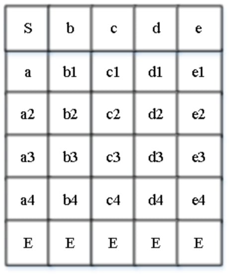 Firstly, the spatial data matrix of the hand for each frame of action is constructed. In the space, the hand wrist is connected to each finger, and the joints at the wrist are kept relative to each joint of the finger. In this paper, the model hand data are visualized by setting the representative letters from thumb to little finger as a, b, c, d, and e. The corresponding joints are represented in the form of a2, b1, c3, d4, etc. As the thumb lacks a node shared with the other fingers, there is no a1 in the matrix. The first of the two nodes of the joint at the wrist is set to the thumb as the starting item of the data, and is denoted by S (start), and the last node ending item is denoted with E (end). The joints of the finger roots are adjacent to the wrist, and the joints of the remaining corresponding fingers are adjacent to the joints of the adjacent fingers in the space position. Among them, the joints of the thumb and pinky fingers are located at the edge of the space, and the joints of index, middle, ring and oinky fingers are located at the top of the palm in space. A frame of data is processed into a two-dimensional matrix with a size of 5*6 and thirty nodes, as shown in Figure 5. The data thus processed maintains the relative position of each finger joint in space, from left to right is the distribution of joints according to the order of the virtual hand model, and from top to bottom is the adjacent distribution according to the joint connection of each finger of the virtual hand. The bottom layer is set with multiple end joints, which is to ensure that the joints near the wrist of each finger can be directly adjacent to the wrist joints, so it can be effectively ensured that each finger is directly adjacent to the wrist. In addition, for each finger, it is only necessary to consider the information of each joint in the space.