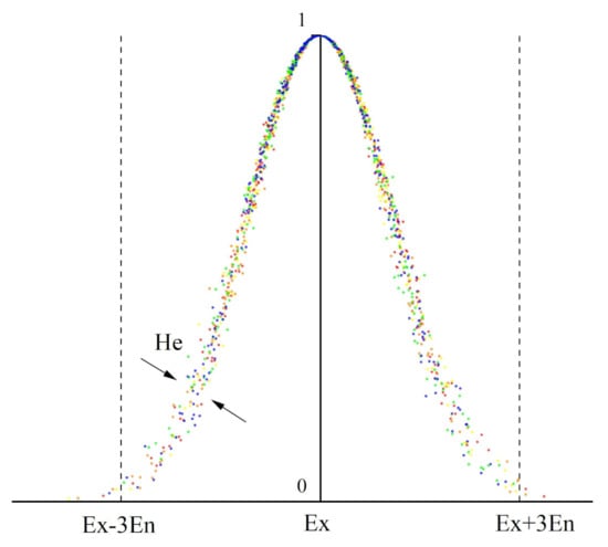 where d denotes the maximum dimensionality of the generated cloud model, is the i-th j-dimensional normal random number generated with as expectation and as variance, and is the i-th j-dimensional normal random number generated with as expectation and as variance. Finally, let be the cloud drops.