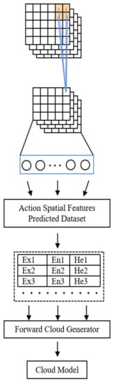STCNN-MCM consists of the following main steps. 1. , m frames of data as the input of STCNN to predict the action features of frames. 2. n predictions are made, and the prediction results for a total of n frames together form the set of prediction results as the action features for the next moment. 3. Cloud transformation is used to convert the motion features in the prediction-result set into numerical features of clouds. 4. The affiliation degree scores calculated from all the predicted motion results obtained from each cloud to determine the attribution of each prediction result to the cloud. 5. For each prediction result set, the forward cloud generator is used to generate the same number of cloud drops to construct a multidimensional cloud model. 6. The multidimensional cloud model constructed from the predicted dataset is compared with the multidimensional cloud model constructed from the real action data to obtain the probability of the predicted motion position in the real action. The construction process of the multidimensional cloud model for predicting actions is shown in Figure 10.