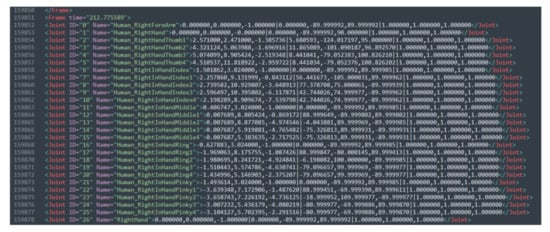 The standard action data were established by skilled operators of the power grid, and after operating in the training system, a set of these actions was selected that could be used as the judging standard. The whole operation process took about 23 s and a total of 678 frames of data were obtained. Each frame of data included three values of coordinate offset, rotation angle, and scaling factor in virtual space for 27 nodes (24 finger nodes, 1 wrist node, 1 hand center node, 1 node representing the entire hand model), which could be obtained based on the virtual glove. Some of the data for the standard action are shown in Figure 12.