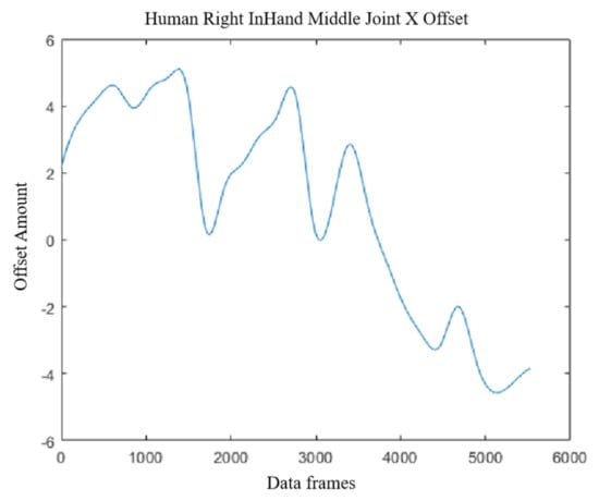 As shown in Figure 13, below, the offset of the human right-hand middle joint on the x-axis changes. In the virtual space of the movement process, joints need to first move in the counterclockwise direction, in the early move to the tool table to pick up the apparatus faster, pick up when the offset becomes smaller, and then slowly move to the distribution box for power testing operations; the x-direction offset becomes smaller and there is a smaller moving distance during electricity testing. Finally, returning to the tool table, the horizontal offset is negative, and the initial direction of movement is opposite, in line with the law of motion. This shows that the experimental data obtained from the overall operation is reliable.