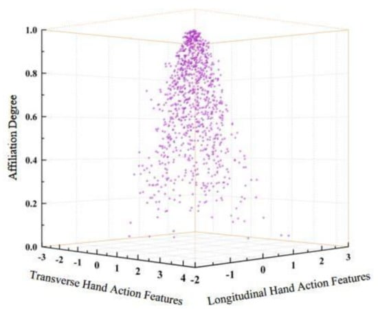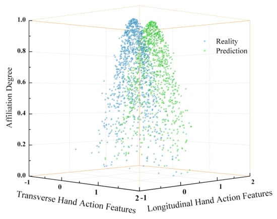 Figure 15, below, shows the cloud model generated with the change in motion features at a certain moment. The vertical axis in the figure refers to the affiliation degree, which is a measure of the stability of the tendency of the current motion to belong to the target motion, and the horizontal axis is the feature values of the longitudinal features of the hand motion and the transverse features of the hand motion in the multidimensional cloud model. From the figure, it can be seen that the points with probabilities greater than 0.7 are more dense, indicating that most of the predictions are in accordance with the changes in real power operations when the STCNN prediction is performed.