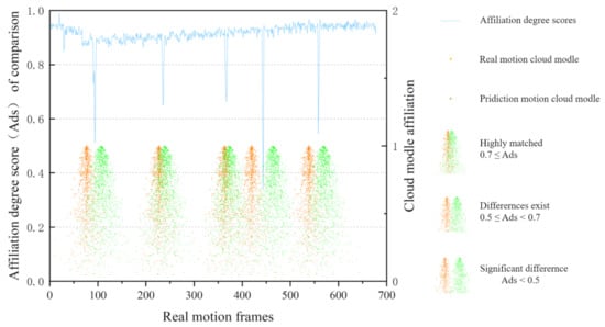 Based on the multidimensional cloud model constructed by the actual action, the predicted action features are computed and generated as cloud drops and then compared in cloud space to obtain their probability of conforming to the change in power operation. All the collected frames in every 20 frames and all the previous frames can be used to build a 3D cloud model representing the actual action features. The 3D cloud model includes the offset features in x, y and z directions, and the affiliation of each cloud droplet in the set is actually a four-dimensional value.