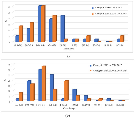 The centroids calculated by clustering provide an overview of the variation in electricity consumption during different periods. The relative deviations can be calculated as and , where is the electricity consumption in the first time interval (i.e., years 2016–2017), is the electricity consumption in the second time interval (i.e., the year 2018), and is the electricity consumption in the third time interval (i.e., 2019–2020). The relative changes in the electricity consumption pattern at different time intervals are calculated. Based on that, the distribution in the relative changes is displayed in Figure 5 using histograms.