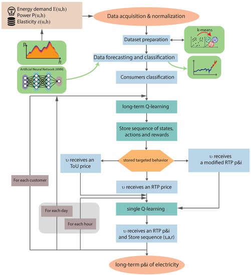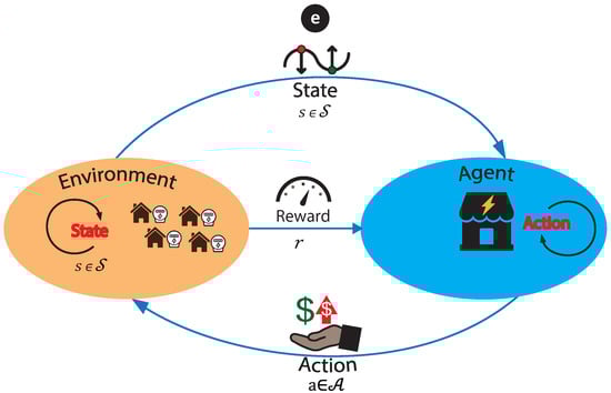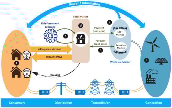 Among the actors participating in this market, retailers Figure 2d take on a substantial relevance in this work because the reinforcement learning tool Figure 2e will allow economic planning of the resale of energy from the wholesale market to consumers. For this reason, it is required that the planning must be carried out in the two time periods (day-ahead and real-time, respectively). In this sense, retailers must balance energy supply and demand economically. Traditionally, this balance was achieved by adapting the supply of electrical energy to the demand of the system, that is, the consumers. However, due to the considerations mentioned earlier of the massive penetration of non-conventional RES, it is necessary to have flexibility in demand, which will also allow demand to be adjusted to supply.
