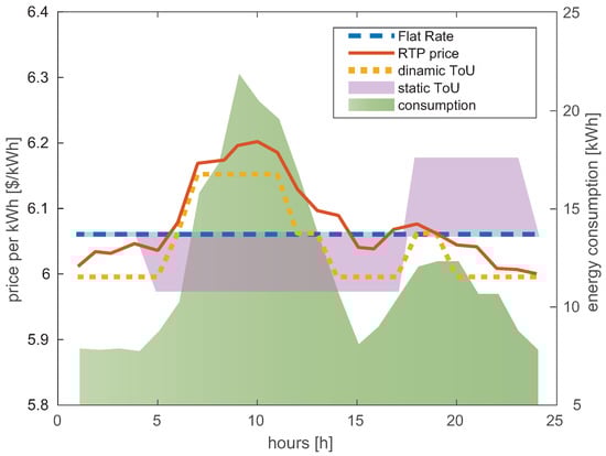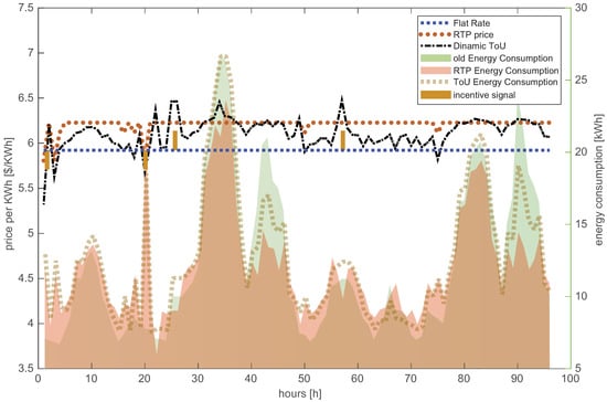 For the instant of time , the algorithm compares the estimated behavior of the consumer through the historical ones and, throughout each hour, modifies its elasticity and a proposed factor, called the experience factor, which allows, on the one hand, modifying and personalizing prices to obtain incentives based on the experience of their behavior throughout the day. However, it is essential to point out that the algorithm considers a possible scenario when the consumer does not respond to the demand response program; that is, the consumption is not modified compared to the historical one. In this case, shipping pricing will approximate a less variable and approximate pricing scheme (similar to a ToU time of use scheme). Furthermore, if the consumer does not respond to this simplified pricing scheme, the scheme will eventually convert to a fixed pricing scheme, known as a flat rate. Here, the question could arise as to whether the scheme could first consider a flat rate and then become a real-time hourly price scheme, an action that the algorithm can effectively carry out. However, it is not the focus of this work since the proposed hypothesis considers, in the first instance, that the consumer is willing to participate in modifying the electricity demand.