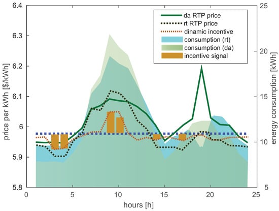 Once consumers receive the 24 prices for the next day, as mentioned, they can plan their consumption according to their elasticity. However, this proposed approach to reinforcing consumer participation also operates in the real-time adjustment market. Therefore, we are now going to focus the analysis on this scenario. At this moment, the algorithm already has historical information on consumers. Therefore, the algorithm can estimate the possible behavior of the consumer, which allows obtaining a priori incentives; these incentives will be sent in connection with a satisfaction function. In this sense, the consumer also receives a finite number of incentives for hours required to change the behavior, and the elasticity has low values; this approach is based on the critical peak price (CPP) mechanism.