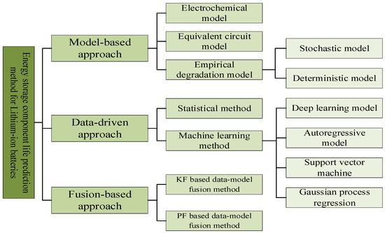The model-based approach analyzes the battery operation mechanism and relies on the development of electrochemical, equivalent circuit, and empirical degradation models to describe the degradation mechanism of the system state from the perspective of the essential mechanism of the electrochemical reactions of lithium-ion batteries [31].