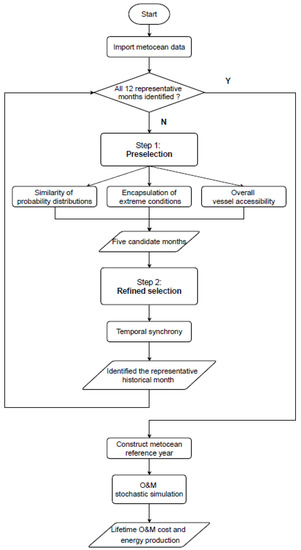 In order to overcome the limitation of computational inefficiency and enhance the practicality of O&M stochastic simulation, in this study, a hierarchical statistical model is proposed to identify the most representative historical month from the long-term met-ocean data for each calendar month and generate a met-ocean reference year with one-year equivalent length for an O&M stochastic simulation. Using the yielded met-ocean reference year, the computational efficiency of O&M stochastic simulation can be boosted significantly owing to the major reduction in the input met-ocean time series and the total number of iterations in a Monte Carlo simulation. The proposed model includes two steps: (1) the preselection to produce five candidate historical months and (2) the refined selection to identify the most suitable month from the preselected candidates. The selection process is conducted independently for each calendar month from January to December. In the preselection, three statistical components are incorporated to characterise the similarities between the historical months and the long-term met-ocean data belonging to the same calendar month, including the Jensen–Shannon (JS) divergence [37], the coverage of extreme met-ocean conditions, as well as the availability of met-ocean windows regarding vessel accessibility. In the refined selection, the change patterns of met-ocean conditions between the candidate months and the long-term data from the same calendar month are compared using cosine similarity. As such, the proposed hierarchical model is capable of evaluating similarities on different dimensions, including statistical distribution, temporal synchrony, as well as extreme conditions. The trade off between computational cost and accuracy can be achieved in an O&M stochastic simulation by the proposed data selection model owing to the preserving characteristics of a met-ocean time series in a reduced length.
