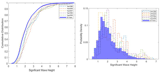 The cumulative distributions (left) and probability densities (right) of significant wave height in March from five candidate months yielded by the component of vessel accessibility.