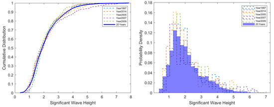 In order to avoid the disturbance imposed by other statistical components, the impacts of each component are investigated separately by switching off the irrelevant ones, i.e., setting weighting factors as 0. For the benefit of comparison, the results of March are used as an example to illustrate the distinctive effects driven by different components. The cumulative distributions and probability densities of significant wave height in March from the five candidate years identified by the three statistical components, i.e., the JS divergence, the extreme condition encapsulation and the overall vessel accessibility, are illustrated in Figure 2, Figure 3 and Figure 4, respectively.