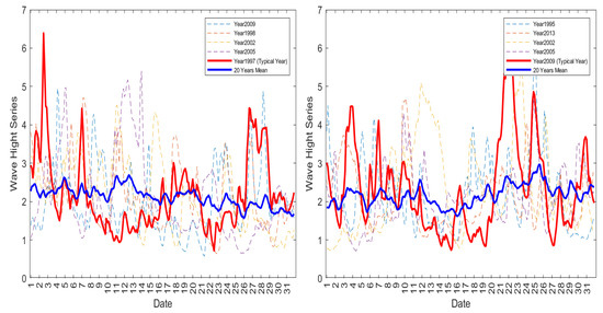 The significant wave height time series of March (left) and October (right) from the most representative years identified by the component of temporal synchrony.