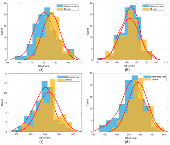 As shown in Figure 6, the histograms for the 20-year case and the representative year are highlighted in orange and blue colours, respectively, whereas the red curves denote the fitted probability density functions based on the histograms. The constructed distributions of the lifetime O&M cost for the representative met-ocean reference year demonstrate high similarities to those yielded by the twenty-year met-ocean data. More specifically, the two types of distributions exhibit identical patterns characterised by predominant overlaps and homogeneous spectrums. This similarity can be observed across different configuration scenarios. Furthermore, the Wilcoxon rank sum test is conducted to provide statistical evidence regarding the level of distinctiveness between two distributions in comparison. The rank sum test results are higher than 0.05 for all tested configuration scenarios, i.e., 1.89 × 10−1, 9.58 × 10−1, 1.53 × 10−1and 9.39 × 10−2 for 5, 10, 20 and 30 wind turbines, respectively, as shown in Table 6. As a result, the hypothesis that two distributions are likely to be derived from the same population cannot be rejected. As such, the original lifetime O&M cost distributions can be reproduced with a high level of confidence by using the representative met-ocean reference year, as evidenced by the results of the statistical test and different configuration scenarios.