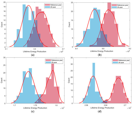 The lifetime energy production distributions resulted from the representative met-ocean reference year and twenty-year met-ocean data for (a) 5 turbines, (b) 10 turbines, (c) 20 turbines, (d) 30 turbines.