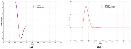 The proposed PLL and its small-signal model at t = 0.02 s under (a) + at and (b) Hz at .