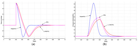 Figure 9. The results of case 1 at and at t = 0.02 s: (a) PLL’s phase error: (b) the frequency estimated by PLL.