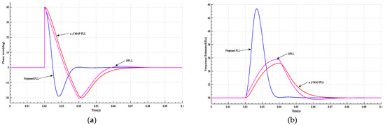 Figure 8. The results of case 1 at and at t = 0.02 s: (a) PLL’s phase error; (b) the frequency estimated by PLL.
