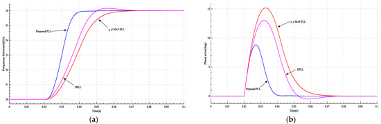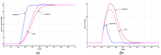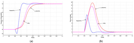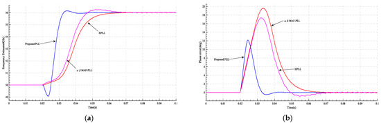 Figure 16. The results of case 4 at and t = 0.02 s: (a) the frequency estimated by PLL; (b) PLL’s phase error.