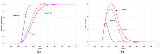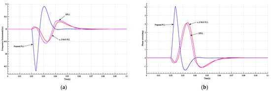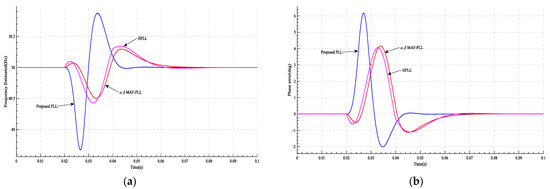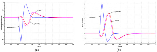 Figure 15. The results of case 4 at and at t = 0.02 s: (a) the frequency estimated by PLL; (b) PLL’s phase error.