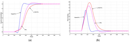 Figure 17. The results of case 4 at and t = 0.02 s: (a) the frequency estimated by PLL; (b) PLL’s phase error.