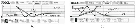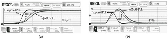 To demonstrate the performance enhancement of the proposed PLL and the LF design with comparisons to HPLL and αβMAF-PLL, digital implementation of all the PLLs is made utilizing the DE2-115 development and education board from Altera. An AC power supply is used to generate the voltage signal. The experiment maintains the grid voltage amplitude (V) and sampling frequency () at 1 pu and 10 kHz, respectively. The nominal grid frequency is 50 Hz. The results are captured using RIGOL MSO5354 mixed-signal oscilloscopes. Two cases are considered adopting without loss of generality.