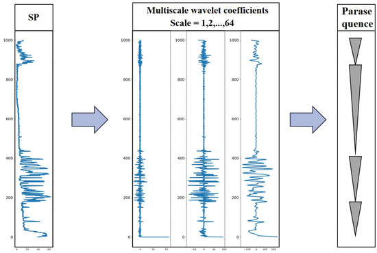 One issue we wish to address is how to include additional geological information in our model. Geological researchers have recently adopted wavelet transform as an efficient tool in the analysis and processing of logging data due to its multi-scale analytical properties [44,45,46]. The logging curve and its wavelet-transformed time-frequency diagram are shown in Figure 2, where it is clear that the wavelet transform is more sensitive to the abrupt changes in the logging curve, and can recognize its singularity with accuracy. In geological analysis, scientists have applied logging data to a variety of stratigraphic divisions using wavelet transform. This involves both the identification of singularity through the extraction of the time-frequency characteristics from the logging curves and the analysis of the geological sedimentary cycles included in the logging curves using wavelet transforms. To accomplish single-well sequence division, it is necessary to establish a correlation with the sequence boundary at each level by examining the periodic oscillation traits displayed by wavelet coefficient curves at multiple scales. The logging curve is selected for wavelet transform to obtain wavelet coefficients. Moreover, the stratigraphic division is accomplished by analyzing the wavelet coefficient curves for periodic oscillatory or modulus maxima. Figure 3 illustrates the stratigraphic division procedure utilizing the wavelet transform.