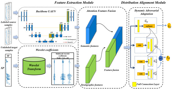 Specifically, our proposed overall network consists of a distribution alignment module and a feature extraction module. We employ a two-stream structure in the feature extraction module, with the upstream structure (UAFN) utilizing the widely used U-Net framework and AFF to enhance the skip connection in U-Net. The downstream structure uses wavelet transform to process the SP curve to obtain the stratigraphic features represented by wavelet coefficients. Then, the stratigraphic features from downstream structure and the semantic features from UAFN are fused with AFF, and the fused features are the output features of the whole feature extraction module. Finally, the distribution alignment module uses the DAA to align the output features from the feature extraction module. Figure 4 illustrates the overall structure of the network. We add a regularization term to prevent overfitting from decreasing network performance.