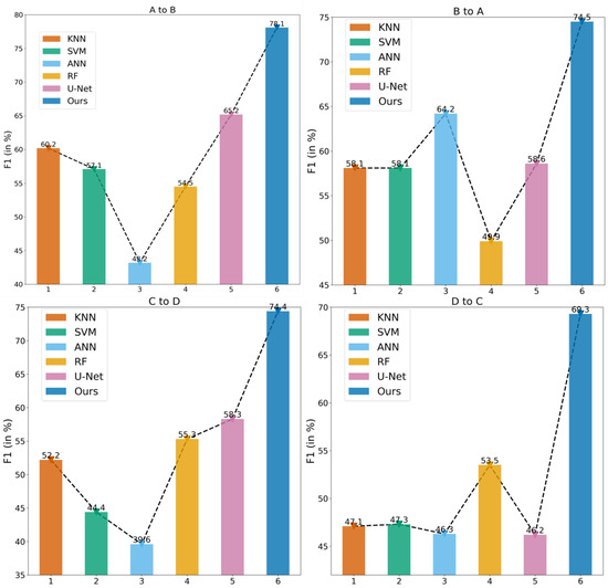 We set the hyperparameters of each methodology in accordance with the respective hyperparameter setup protocol and utilized KNN methods as baseline classifiers. Additionally, we performed five experiments and recorded the Macro-F1 values each time. Finally, we took the average Macro-F1 value of each method as the final experimental result, as shown in Figure 5. In comparison to existing typical lithology classification methods, our proposed method has a number of benefits, with average Macro-F1 values on datasets 1 and 2 of 76.3% and 71.85%, respectively. The results show that the segmentation model is able to extract more effective features compared to other models in the case of an increase in logging curve. More lithological characteristics that are present in the logging curves can be extracted by combining the geological information found in the wavelet coefficients with the semantic information.