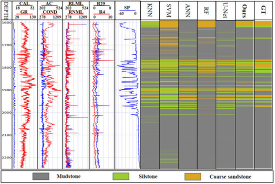 Figure 7 shows some of the real log curves from well B used in our experiments, as well as the manually determined lithology of the corresponding depth. Additionally, the experimental results of our method and other methods are visualized. The three colors in Figure 7 represent lithologies mudstone, silstone, and coarse sandstone, respectively, and the far right of the figure displays the outcomes predicted by our method. The experimental findings of our suggested technique are smoother and more in line with the actual lithological distribution when compared to those of other methods. According to the findings, our method has a significant advantage over other methods.