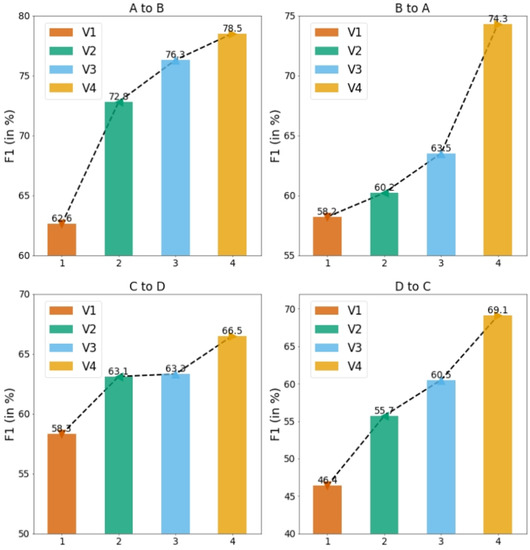 To verify the validity of each component in our proposed method, we decompose the overall structure, as shown in Table 2. The experimental results for the four lithology identification tasks mentioned above are shown in Figure 8. The findings demonstrate that the DAA and wavelet transform contribute more to the enhancement of model performance. The average 6.25% improvement in model performance with the inclusion of wavelet transform demonstrates the effectiveness of the geological characteristics incorporated in the wavelet coefficients for lithology prediction. The DAA may successfully align the feature information found in various well-to-well logging curves, as seen by the 6.5% average gain in model performance that followed its addition. In addition to replacing skip connection, the AFF fuses two features in the model. It retains more useful feature information than traditional feature stitching, which results in a small improvement in the performance of the model as a whole. Last but not least, while the performance of the cross-well classification task from large to small data on was only improved by 2.7%, we found an average increase of 10.3% in V4 compared to V3 in migration experiments from small to large data on . This finding suggests that wavelet transform is able to extract more useful features with fewer data in the source domain. Consequently, wavelet transform introduction is crucial for the cross-well lithology identification task with limited source domain data.
