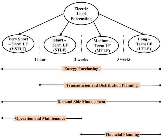 LF is defined as the technique used by SGs to predict the energy needed to meet the consumers’ requirements [23]. Precise electric LF is significant in terms of economic, stability, and reliable operation of the power systems. It helps the SGs to make important decisions including decisions on purchasing and generating electric power, load switching, infrastructure management and on how to plan energy upgrades since they can understand the future consumption and load demand, it also helps to avoid under or over-power generation [24]. As illustrated in Figure 1 LF, the methods can be divided into four types based on the forecasting horizon [25]: