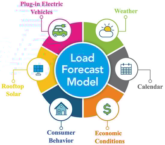 LF plays an essential role in the charging coordination schemes [34] and the management of the energy system, as it can help SGs to manage their capacity and operations to supply reliably all consumers with the required energy. Although this can be very beneficial for SGs, there are several factors to be considered for providing precise data and predictions and for quantifying uncertainties in the future as shown in Figure 2. These factors that can affect the LF model are listed as follows: