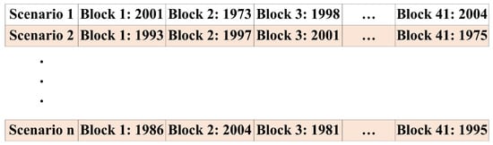 Figure 3. Shifted dates method to generate extra temperature scenarios. - Bootstrap: the climate profile of every original year is segmented into blocks with similar lengths, then the blocks are at random picked with surrogates from any of the original years to create a novel temperature profile [47]. Figure 4 explains the method as follows: in the first scenario, the first block could be obtained from the first block of the year 2001, the second block could be obtained from the second block of the year 1973, and so on [48].