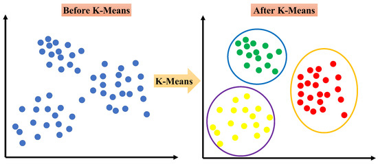To group a dataset using K-means, first, the number of groups needs to be determined, this will be the “K” value in K-means. Then, K random data points need to be generated, these will be the K values. Next, every single data point in the dataset needs to be assigned to one of the groups based on the nearest K value [53]. After all the data points are assigned, the K values need to be updated to become the average value of all the data points which are in the group. Finally, some of the data points will move from one group to another if a different K value is closer than the currently assigned K value. This will happen on a loop until no more data points change groups, which means that an equilibrium has been found [54]. Figure 5 explains the working of the K-means clustering algorithm.
