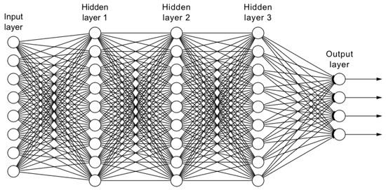 Neural networks (NN) are just trying to figure out what function was used to get from an input number to the output number. The inputs do not necessarily have to be just one number, but they can also be a matrix of numbers. In NN with multilayer perceptrons, there are multiple layers between the input and output layers, known as hidden layers, with a different function between each layer [55]. Figure 6 provides an example of a neural network with three hidden layers. Additionally, between each layer, there are weights, which are what the input is multiplied by, and biases, which are what is added to inputs multiplied by weights to get the output. The goal of training a NN is to find out what are the weights and biases to get an accurate model of some real-life system. This is achieved by randomly generating starting weights. Then, the error generated due to the produced output by the NN and the expected output is calculated. The error is used to slightly adjust the weights and this repeats until the error does not decrease anymore or the accuracy of the system is satisfactory [56].