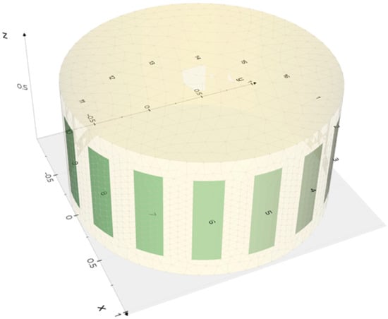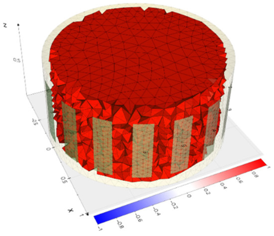 The study involved 5000 simulations of inclusions in a cylindrical pipe divided into 20,455 finite elements. The inclusions varied in diameter and were randomly distributed. Simulation data for both the electrical tomography methods were designed for a tank with 16 electrodes of each measurement type. The interior of the object was divided into 20,445 finite elements with 4837 nodes. ECT electrodes are superficial, while EIT electrodes are point electrodes. Figure 1 shows the simulation of an empty tank. The size of the simulated tank corresponded to the actual dimensions of the reconstruction tank and has dimensions of 320 mm in height and 200 mm in diameter (Figure 2 and Figure 3).